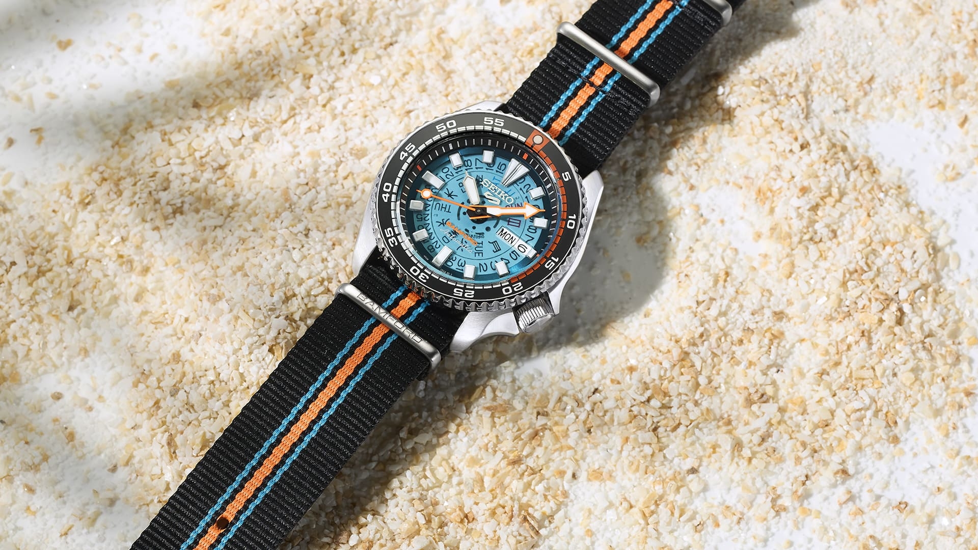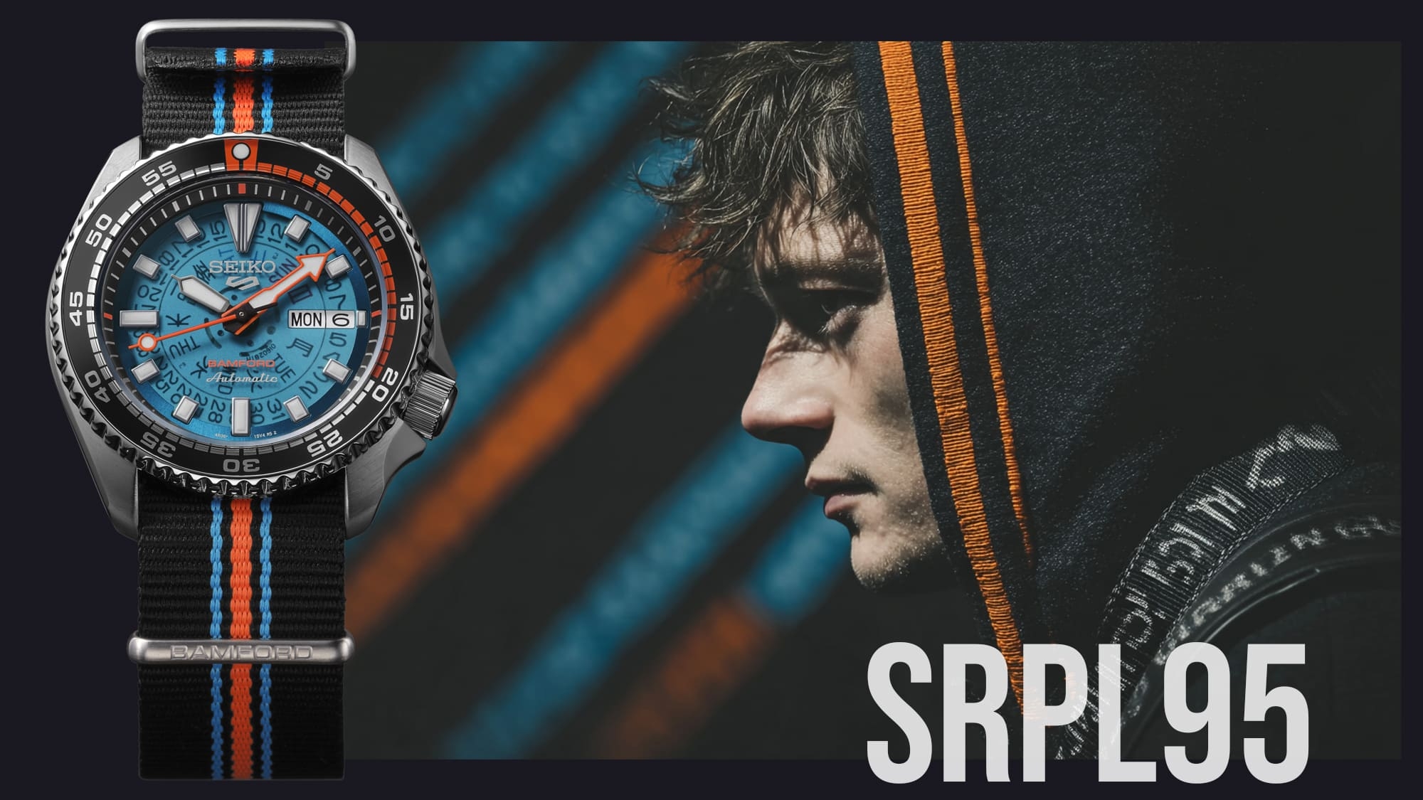 Az SRPL95K1 a hetvenes évek “Time sonar” néven ismert órájának áttetsző számlapját kapta, ami láttani engedi az általában rejtve maradó dátumtárcsákat, ezekből rögtön kettőt is, egyet a hét napjainak és egyet a hónap napjainak, hiszen egy 4R36 kaliberről van szó ennél a modellnél.