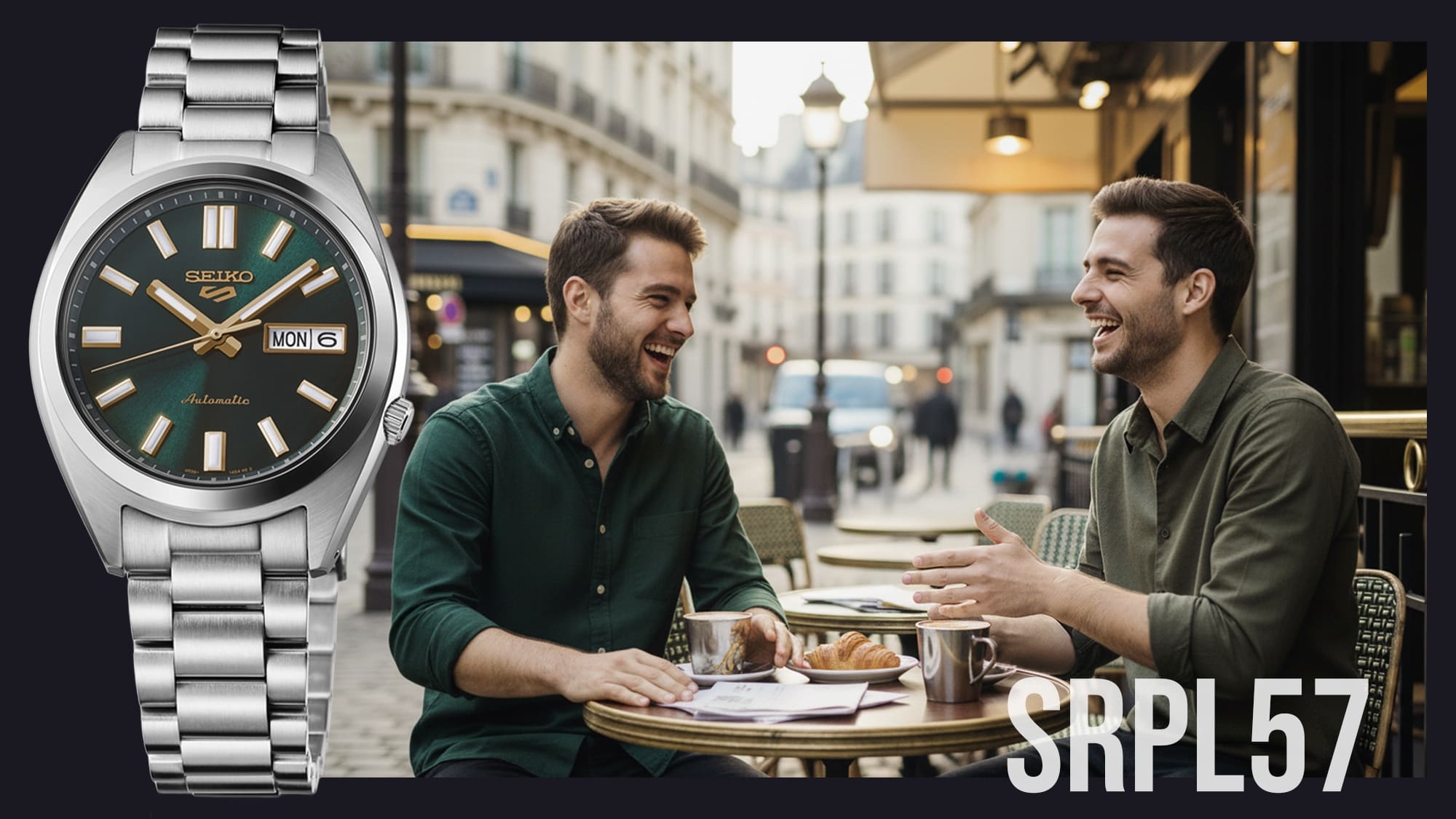 Az SRPL57K1 modell is ezt a színsémát követi, a zöld számlap felett az arany színű mutatók és indexek élénkebben láthatóak, mint a kék változaton, kevéssé visszafogott, mégsem harsány darab.