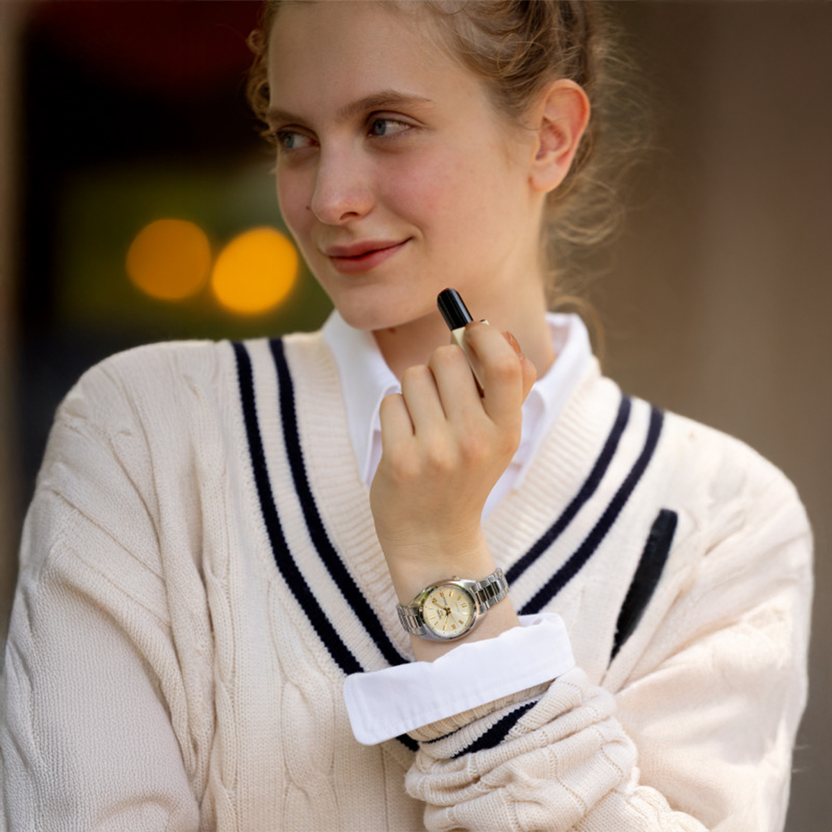 A kellemes, lágy számlapszín az arany kiegészítőkkel finom és elegáns, de ha kell, megállja a helyét egy farmerral is egy nyári estén, univerzális, de az elegánsabb vonalból.