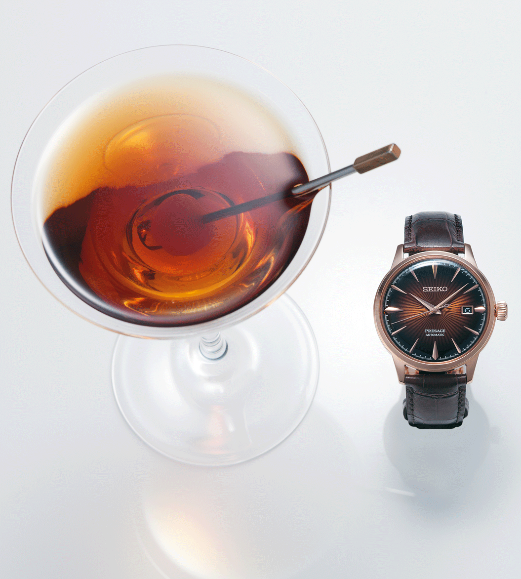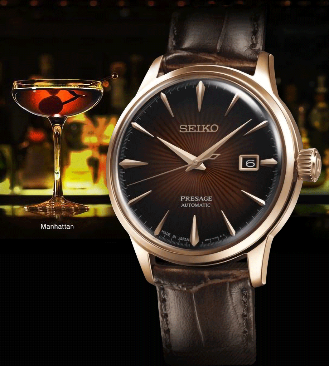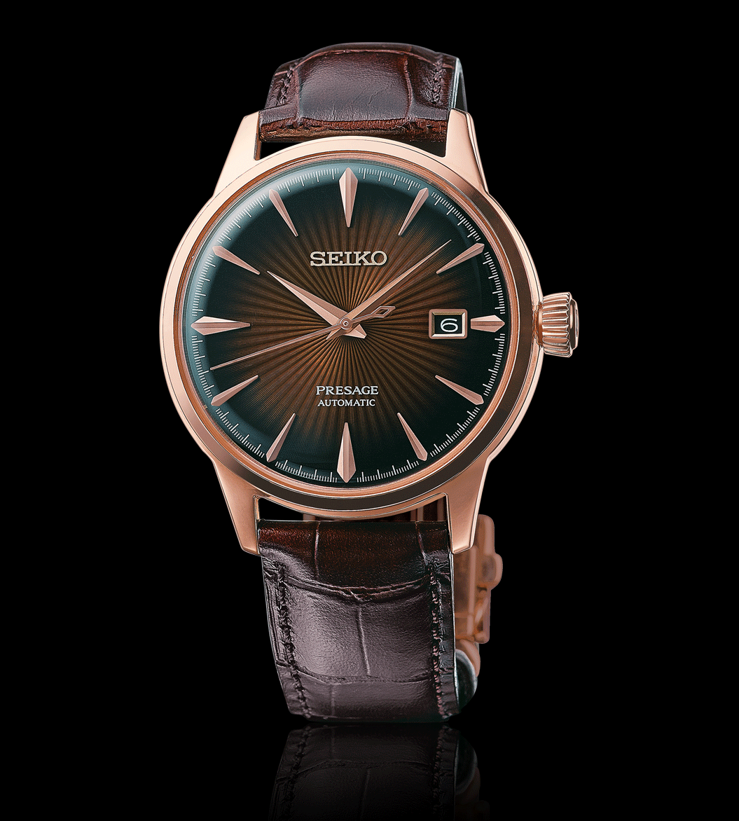 A Seiko Presage Cocktail Time SRPB46J1 egy olyan modell, amely bizonyítja, hogy a barna szín lehet igazán elegáns is. A számlap meleg tónusát a klasszikus Manhattan koktél ihlette – annak mély, borostyános árnyalata és kifinomult karaktere köszön vissza minden részletében. A rózsaarany bevonatú tok harmonikus találkozása ezzel a gazdag barna számlappal kifinomult, mégis karakteres megjelenést kölcsönöz az órának. Ez a kombináció egyszerre klasszikus és modern. A 40,5 mm-es tokátmérő kiegyensúlyozott arányokat biztosít: kellően jelen van a csuklón, mégis megőrzi a dress watch-ok visszafogott eleganciáját. Az órát a Seiko megbízható 4R35 automata szerkezete működteti, amely 41 órás járástartalékkal rendelkezik. Az üveghátlapon keresztül betekintést nyerhetünk a szerkezet finom működésébe, az aranyszínű rotor pedig tovább erősíti a modell elegáns karakterét. A hajlított Hardlex üveg klasszikus megjelenést biztosít, míg az 5 bar vízállóság a mindennapi használat során nyújt biztonságot. A barna bőrszíj különleges zármegoldással készült, amely nemcsak kényelmesebb fel- és levételt tesz lehetővé, hanem hosszabb távon kíméli a szíjat is. Ez az apró, mégis fontos részlet jól tükrözi a Presage kollekció filozófiáját: a tradicionális órakészítés és a praktikus megoldások harmonikus egységét.