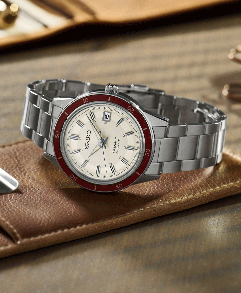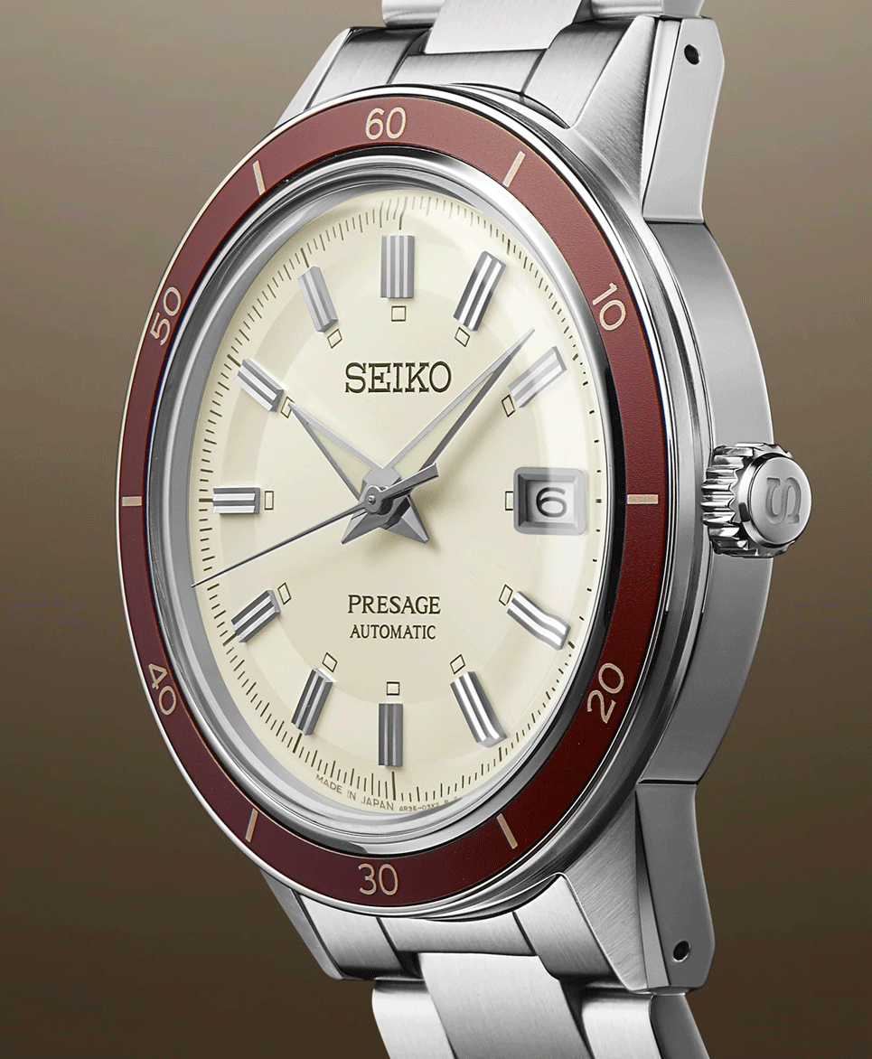 Seiko Presage Style 60’s SRPH93J1 „Ruby”. A klasszikus színek soha nem mennek ki a divatból. Ez vezérelte a designereket a Presage SRPH93J1 modell megalkotásakor, így a kellemes bézs számlappal harmonizáló barnásvörös lünetta a jól ismert tokformával és a fémszíjjal együtt 60 évvel repítenek vissza az időben bárkit, aki ezt az órát felcsatolja a csuklójára. Hagyományos, visszafogott megjelenést kapott a 4R35 kalibernek köszönhetően, és még arra is külön hangsúlyt fektetett a tervezője, hogy a vintage óráknál megszokott fémkeretet is megkapja a dátumablak, hiszen ez a kaliber dátum komplikációt is kapott. Az indexek a Seiko Presage Style 60’s modelleknél megszokott stílusban duplán, illetve a 12-es index esetében triplán metszettek, ami szinten egy jellegzetes apró részlete volt a hatvanas-hetvenes évek óráinak.