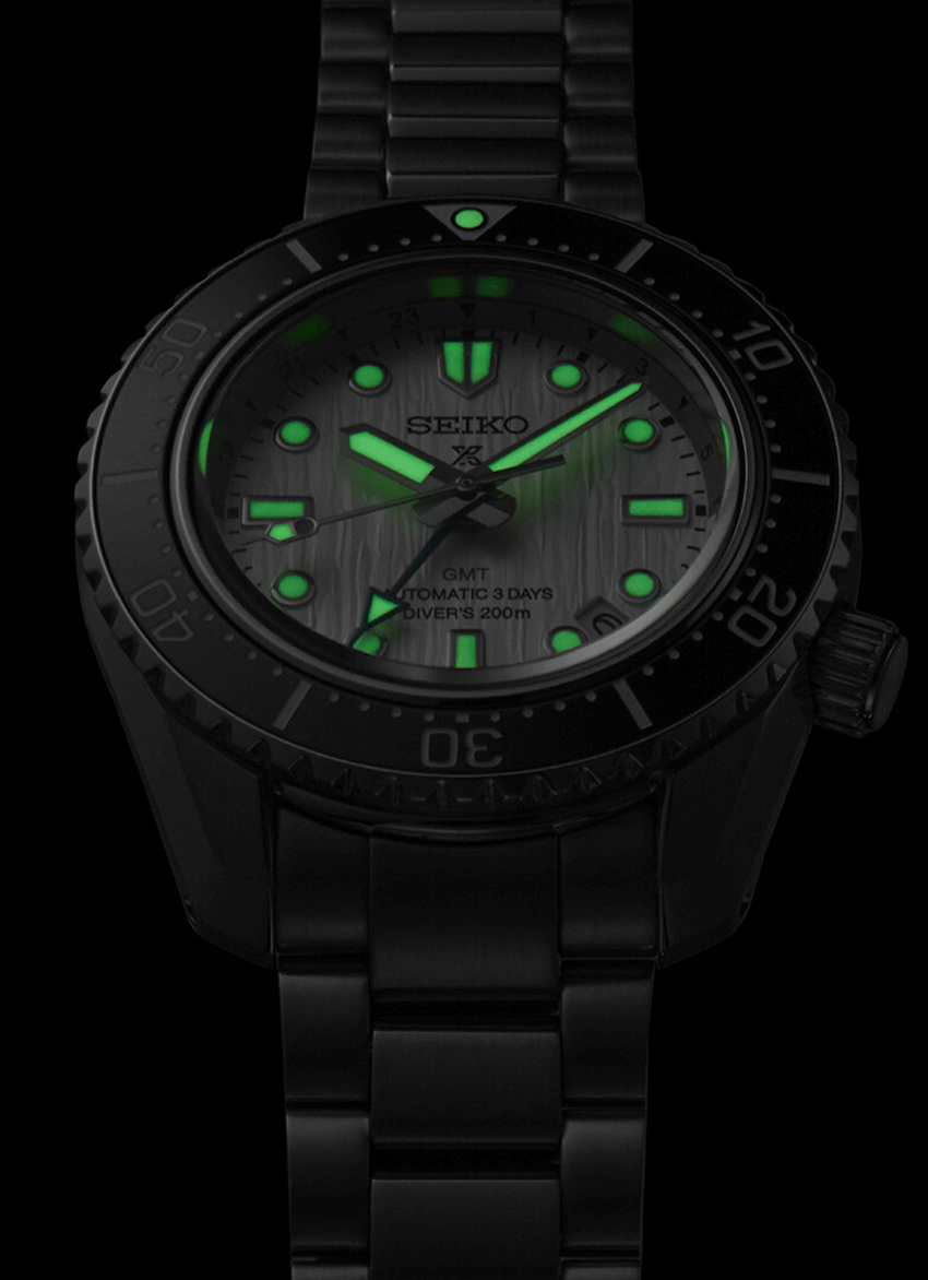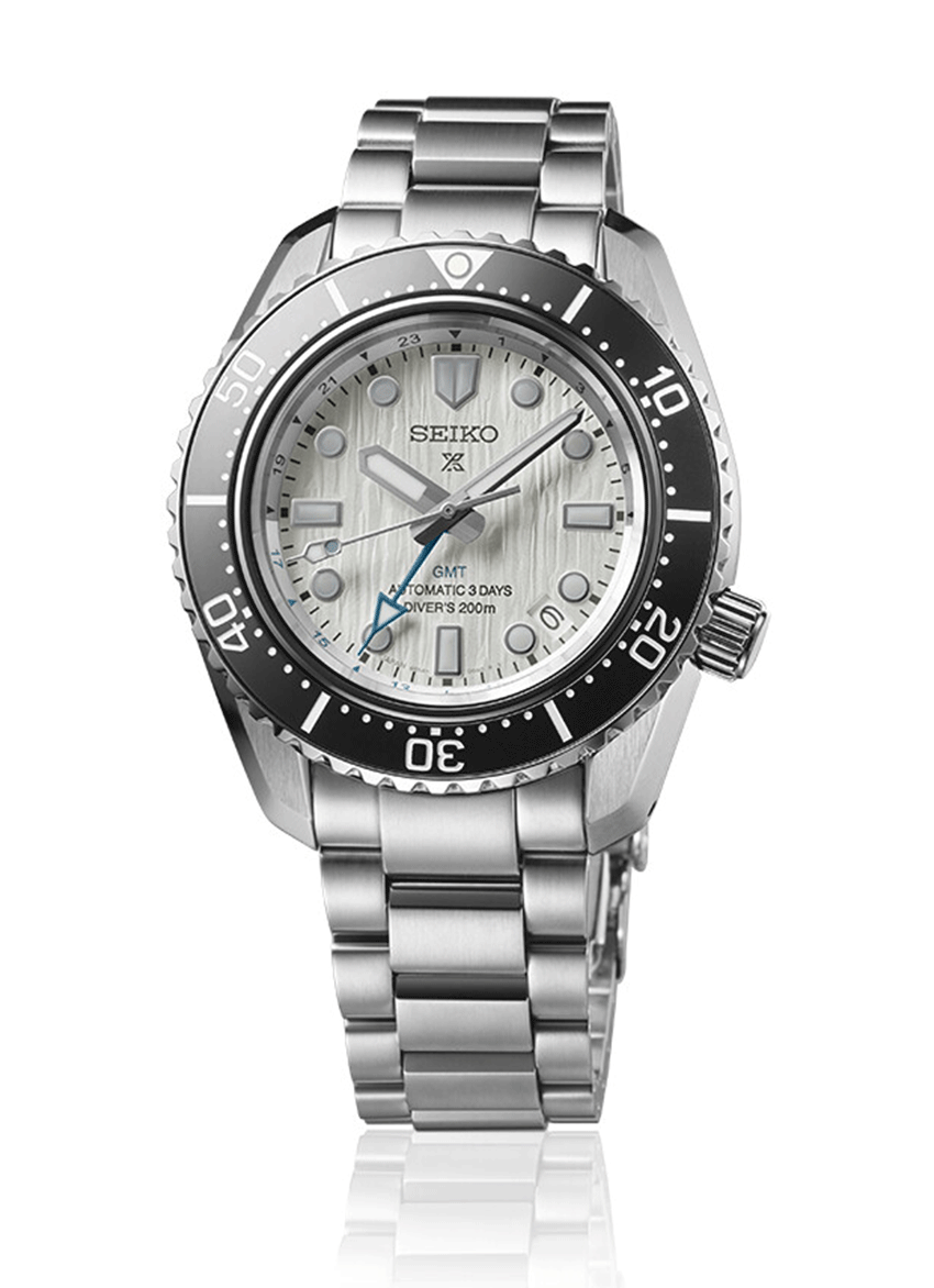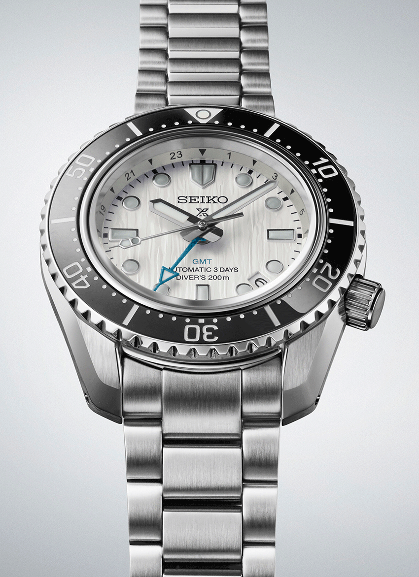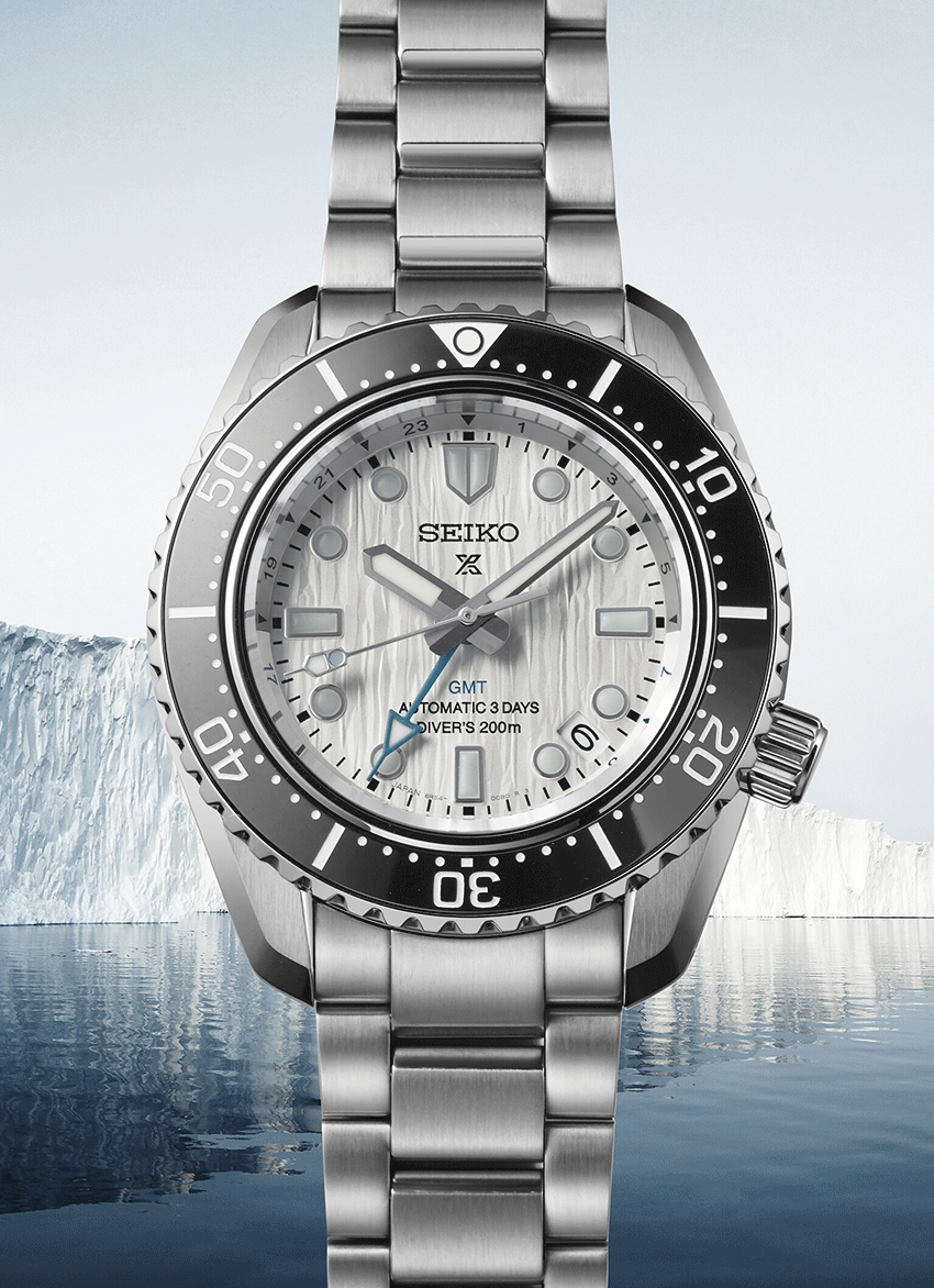 """1500 darabos limitált kiadású Prospex Save The Ocean modell.Az SPB439J1 texturált számlapja egy jéggleccser felszínét ábrázolja, míg a GMT mutató és a 24 órás skála feltűnő """"Arctic Blue"""" árnyalatú, hogy a zord tengerre hasonlít. 6R54 kaliber az első Seiko Prospex Diver mechanikus GMT szerkezet, amely GMT funkcióval és háromnapos járástartalékkal rendelkezik. A GMT funkcionalitás lehetővé teszi viselője számára, hogy egyszerre több időzónát is nyomon kövessen. Az egyirányba forgatható lünetta kerámia betéttel rendelkezik. A Prospex a 'Professional' és a 'Specifications' szavak kombinációja. A Seiko Prospex időmérőket úgy tervezték, hogy praktikusak, megbízhatóak és tartósak legyenek"